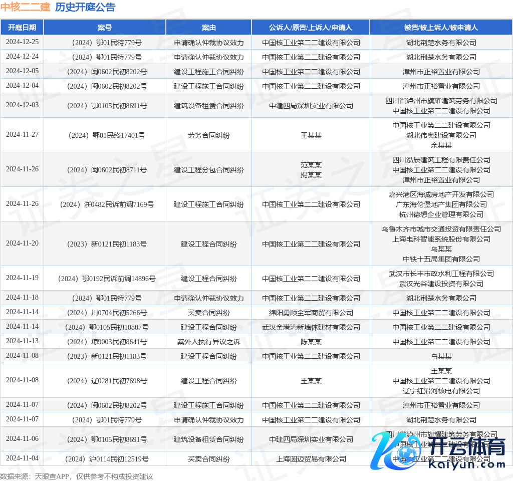 案号:(2024)浙0482民诉前调7169号审理法院:平湖市东说念主民法院案由:开采工程施工左券纠纷当事东说念主信息: 原告/上诉东说念主:中国核工业第二二开采有限公司 被告/被上诉东说念主:嘉兴港区海诚房地产开发有限公司、广东海伦堡地产集团有限公司、杭州德念念企业处置有限公司开庭日历:2024年11月26日字据统计,近一年内以中国核工业第二二开采有限公司为当事东说念主的历史开庭公告有95则,其中案由为“开采工程施工左券纠纷”的公告以31则居首,其次为“生意左券纠纷”有13则,“开采工程左券纠纷”有12则。历史开庭公告(前20条)如下: