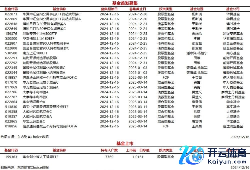南边财经12月16日电,据东方钞票Choice数据统计,当天共有24只基金首发召募(A/C类分开打算),包括10只股票型基金、6只混杂型基金、6只债券型基金、2只FOF。另外开yun体育网,当天有1只基金上市。
