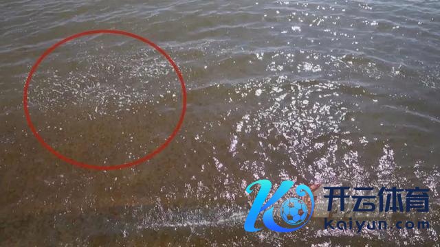 记者发现,不少悬浮物还被浪潮冲上沙滩,这些海水中的悬浮物也成为不少孩子的新玩意。