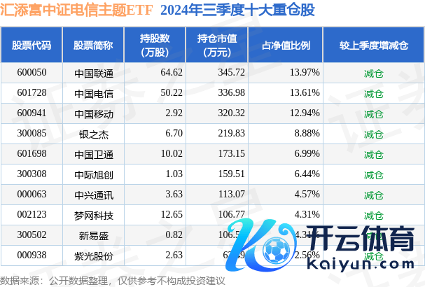 汇添富中证电信主题ETF为指数型-股票基金,字据最新一期基金季报露馅,该基金财富设立:股票占净值比98.56%,无债券类财富,现款占净值比1.86%。基金十大重仓股如下: