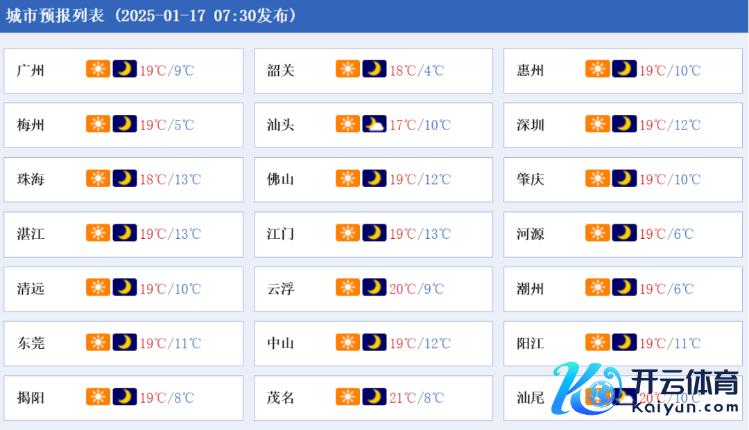 17日,全省晴间多云。最低气温:粤北偏北市县0~3℃,高海拔山区-4~0℃,有冰霜冻,粤北其余市县和珠三角北部3~6℃,南部市县9~11℃,其余市县6~9℃。