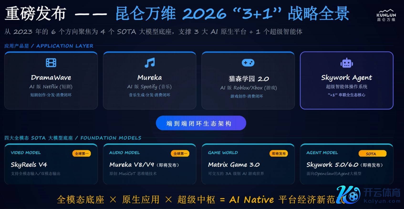 周亚辉称昆仑万维2026年的AGI政策升级为“3+1”生态架构——以4个SOTA大模子为底座,支捏3大AI原生平台+1个超等智能体。全体而言是从全模态技巧突破到AI平台经济生态构建的全体旅途,有筹划是通过打造AI经济平台,赋予每一个创作家匹敌一家公司的全栈分娩力。