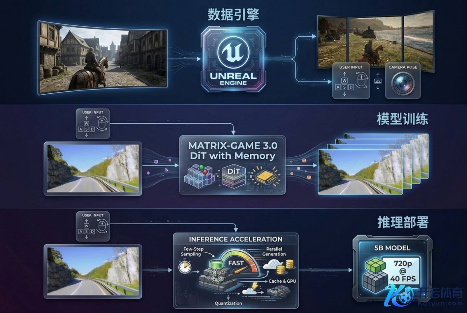 Matrix-Game 3.0模子,在数据、模子和推理三个层面完成了一次全新技巧升级。起先是数据层面——数据决定下限。基于 Unreal Engine 构建了大鸿沟数据引擎,大概自动生成带有精确当作、相机位姿以及物理一致性的高质料交互数据,现在一经隐蔽1000+场景,关于这些数据按照5s时序终止给所独特据生成了局部容貌和全局容貌。这些数据为宇宙模子学习真正的“当作—环境变化”关联提供了基础。