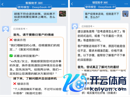 AI加捏,可大幅训诲企业里面互助、客户就业后果。比如,DeepSeek和企业微信中的智能机器东说念主相连之后,客户就业将愈加智能化、东说念主性化。在售后场景下,客户情怀茂盛条款退货,一线客服需要快速安抚客户情怀,同期给出本色贬责决策,异常检会一线东说念主员的个东说念主训戒与临场反映;同期,“客户屡次征询却迟迟不下单”亦然困扰许多一线销售的费事。在DeepSeek加捏下,智能机器东说念主大要快速字据客户情况,给出跟进提出与推导经过,匡助他们了解客户的深层需求。
