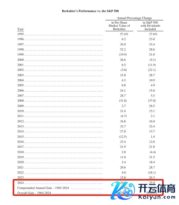 巴菲特在致鼓吹公开信中示意,2024年,伯克希尔每股市值的增幅为25.5%,标普500指数为增长25个百分点。历久来看,1965~2024年,伯克希尔每股市值的复合年增长率为19.9%,较着跳动标普500指数的10.4%。而1964-2024年伯克希尔的市值增长率是令东说念主吃惊的5502284% ,也便是55022倍,而标普500指数为39054%,即390倍。