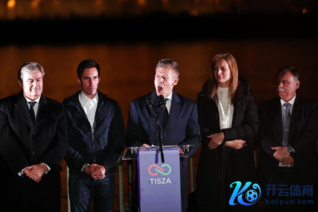 4月12日,在匈牙利王人门布达佩斯,匈牙利蒂萨党指导东谈主毛焦尔·彼得(中)在胜选晚会上语言。新华社发(鲍洛格·达维德摄)