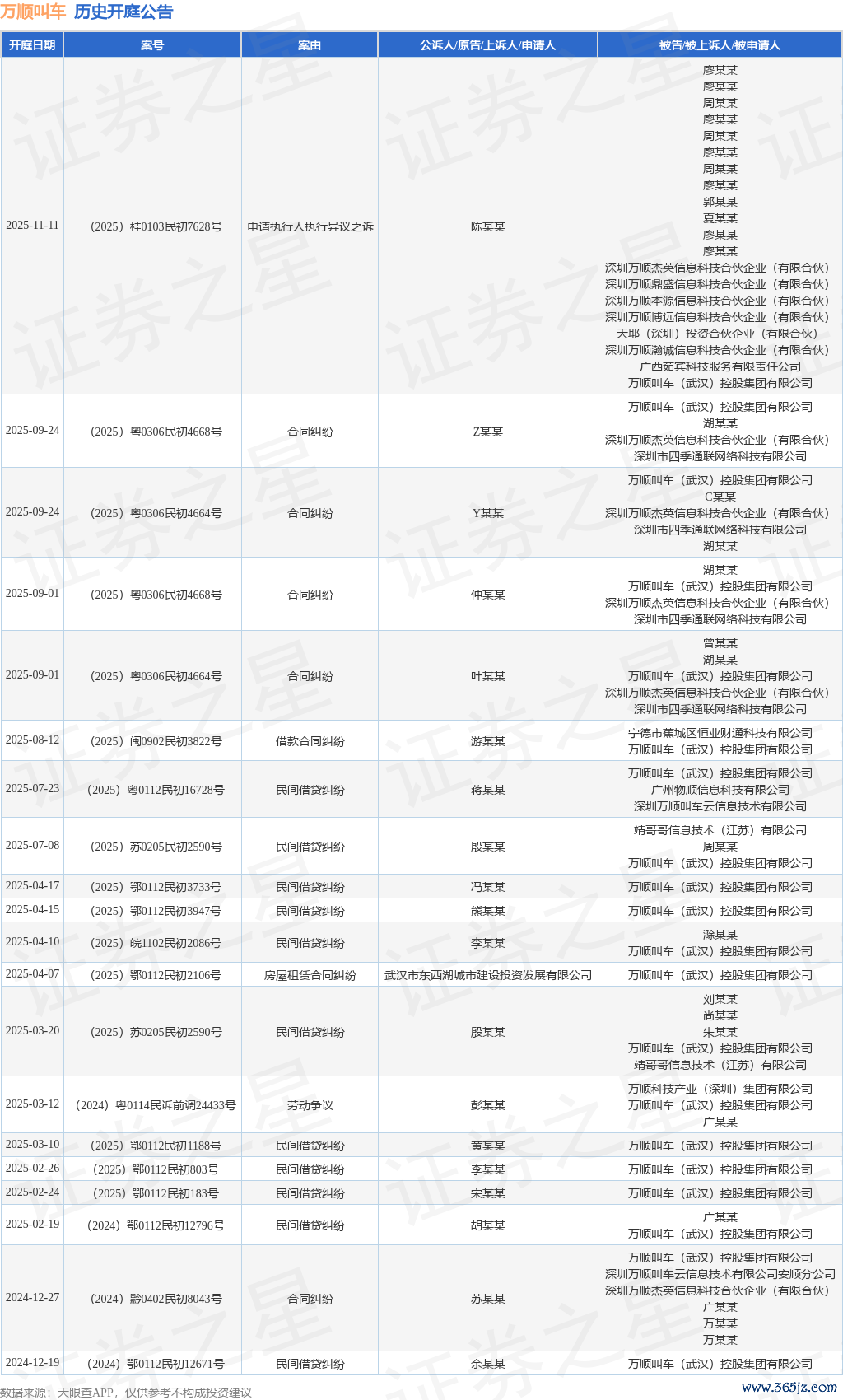 案号:(2025)闽0902民初3822号审理法院:宁德市蕉城区东说念主民法院案由:借款左券纠纷当事东说念主信息: 原告/上诉东说念主:游某某 被告/被上诉东说念主:宁德市蕉城区恒业财通科技有限公司、万顺叫车(武汉)控股集团有限公司开庭日历:2025年8月12日凭证统计,近一年内以万顺叫车(武汉)控股集团有限公司为当事东说念主的历史开庭公告有62则,其中案由为“民间假贷纠纷”的公告以47则居首,其次为“左券纠纷”有7则,“借款左券纠纷”有2则。历史开庭公告(前20条)如下: